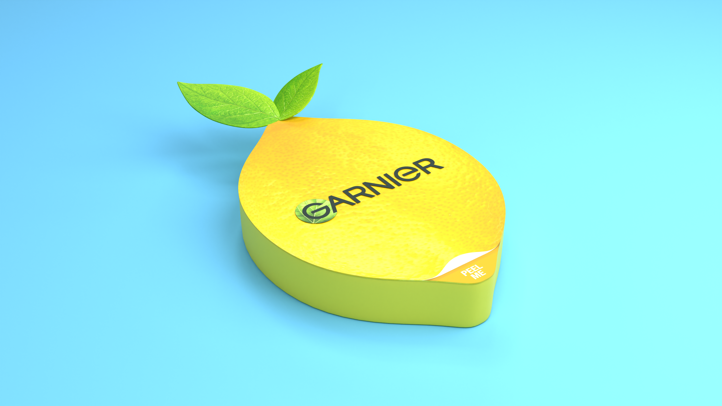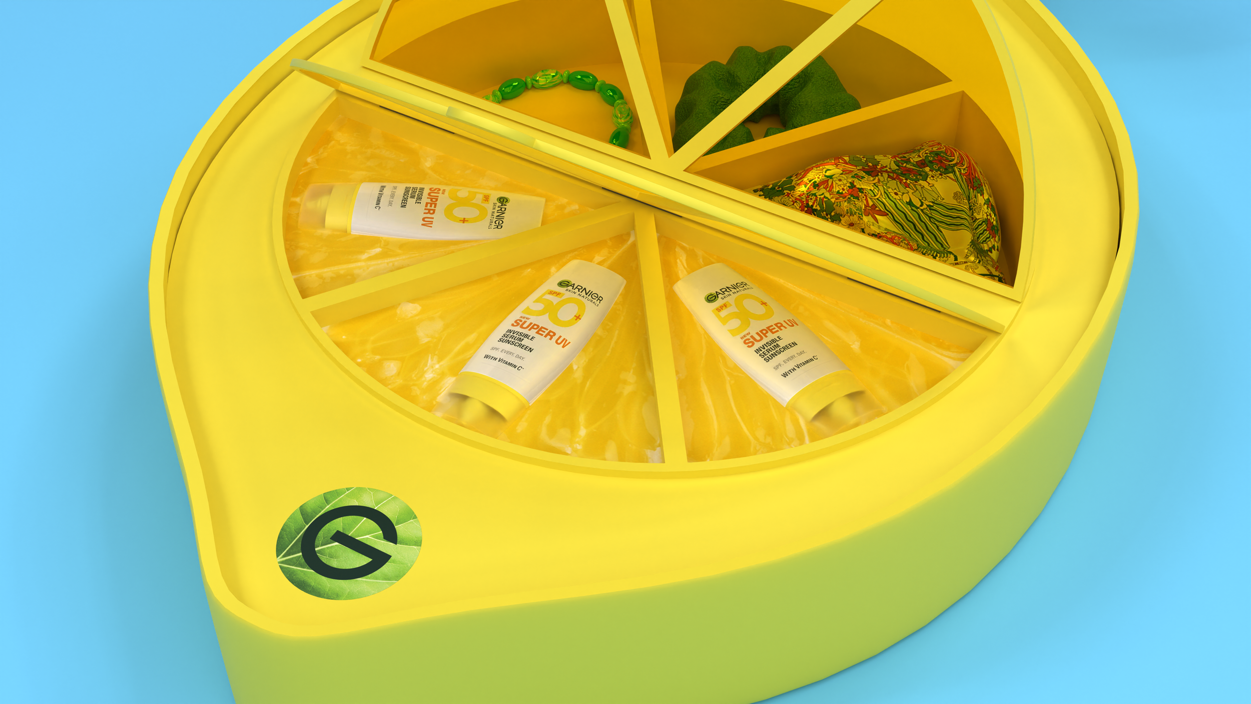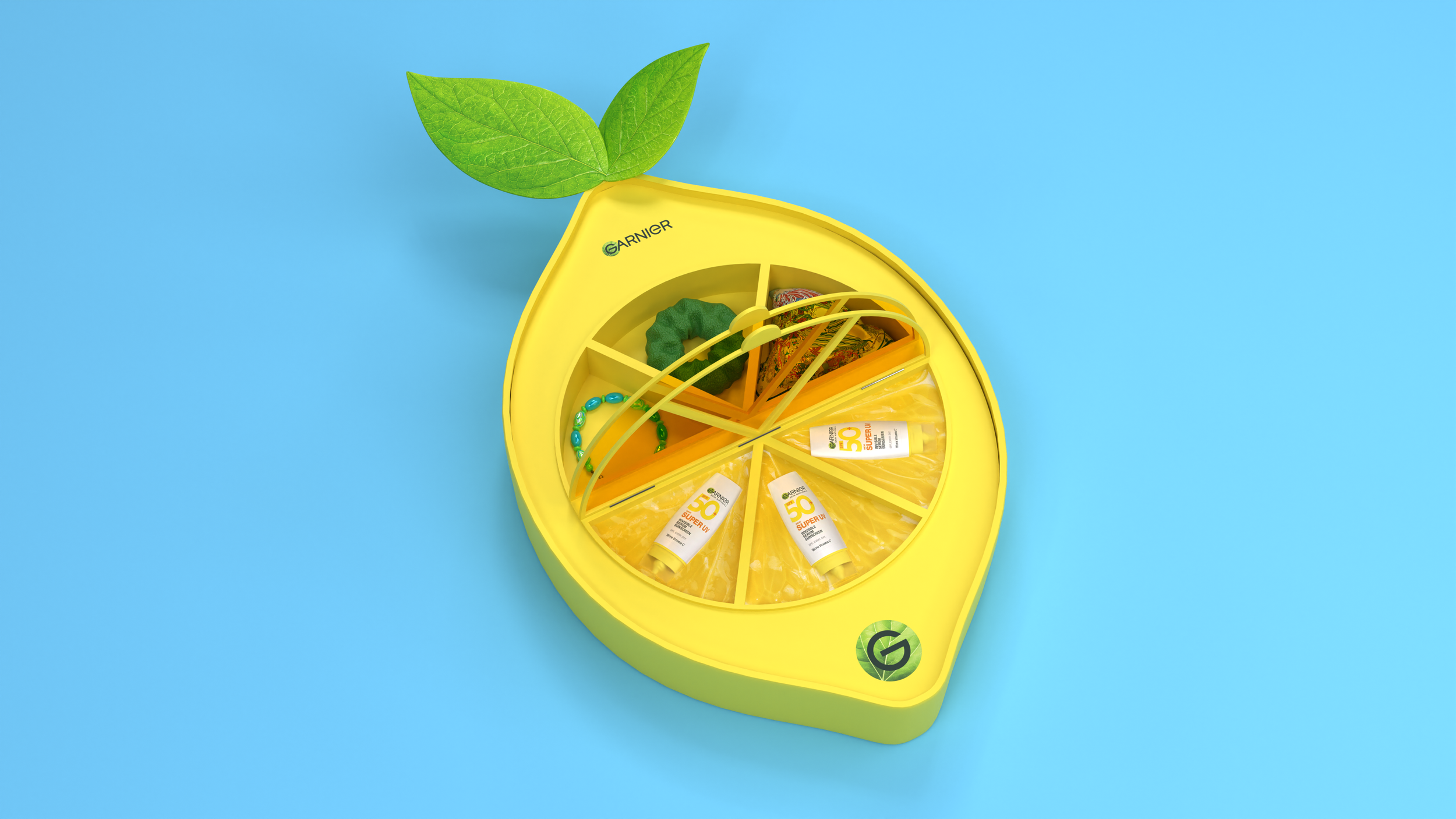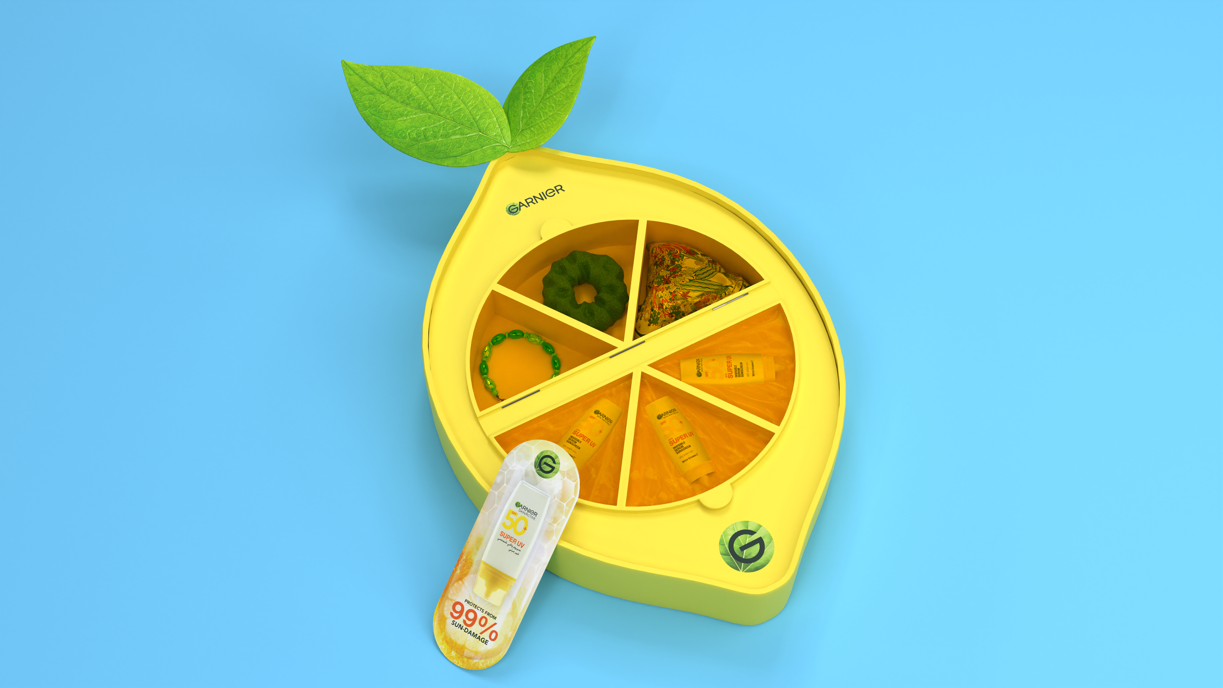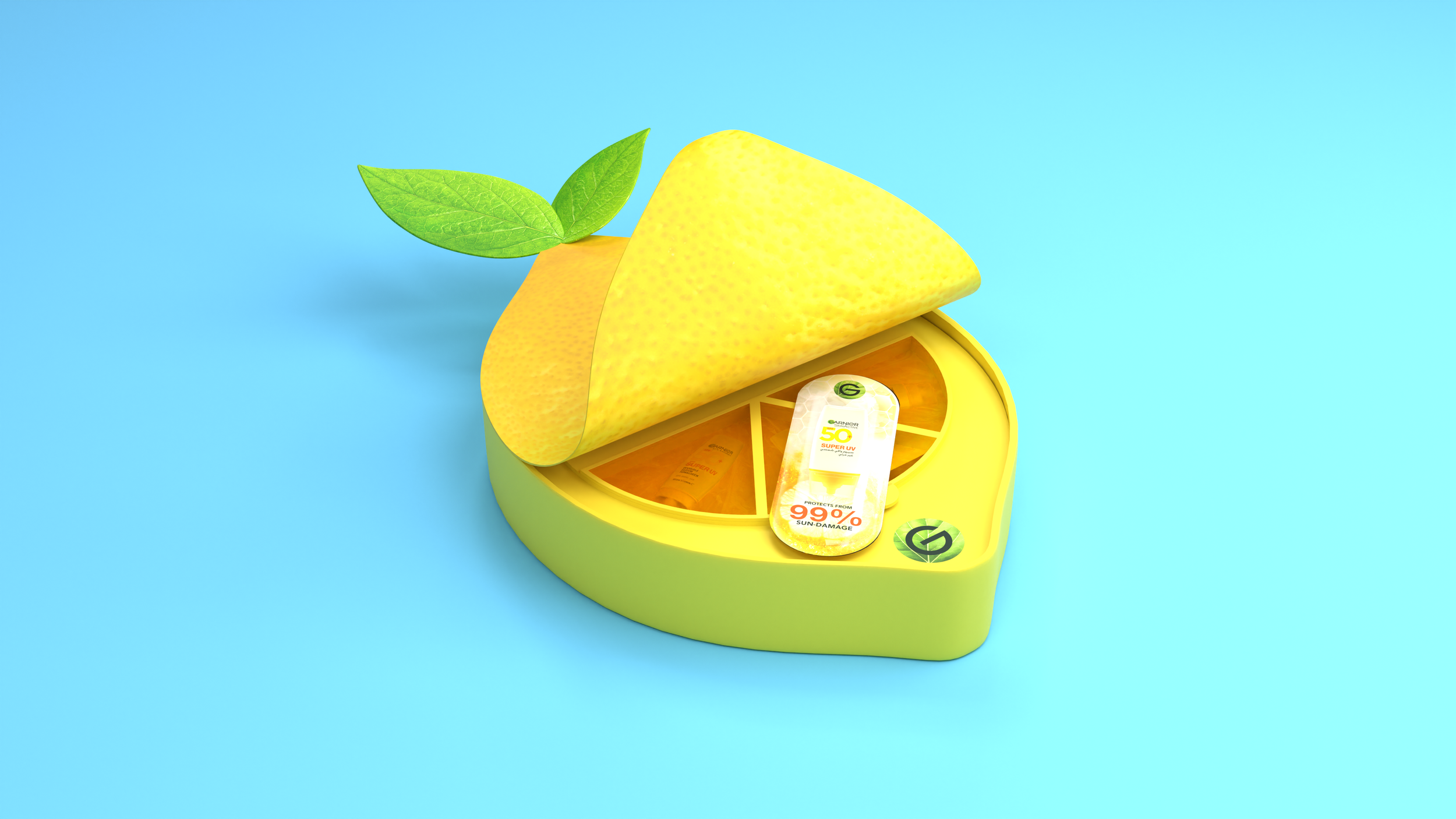 Inspired by the lemon element featured in the key visuals as a source of vitamin C, this Garnier box is designed in the shape of a lemon with a unique opening mechanism.