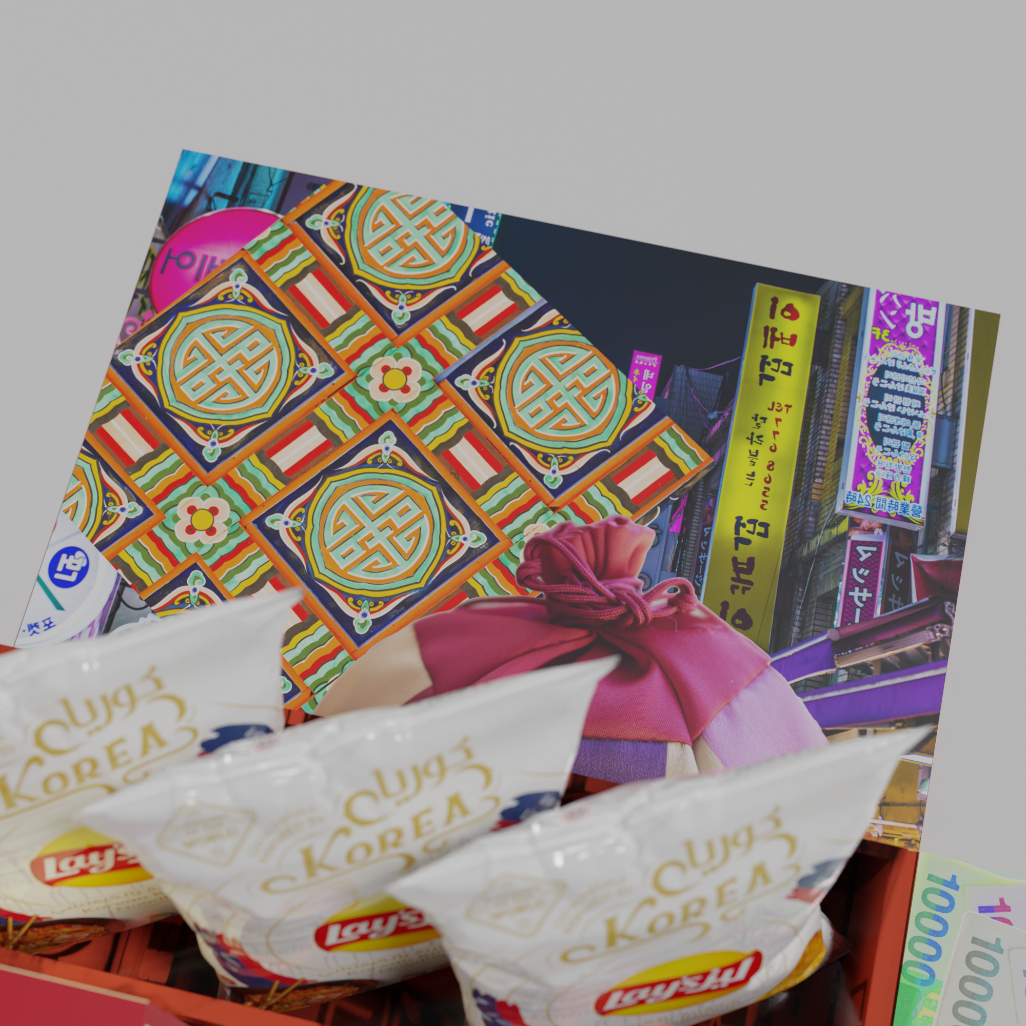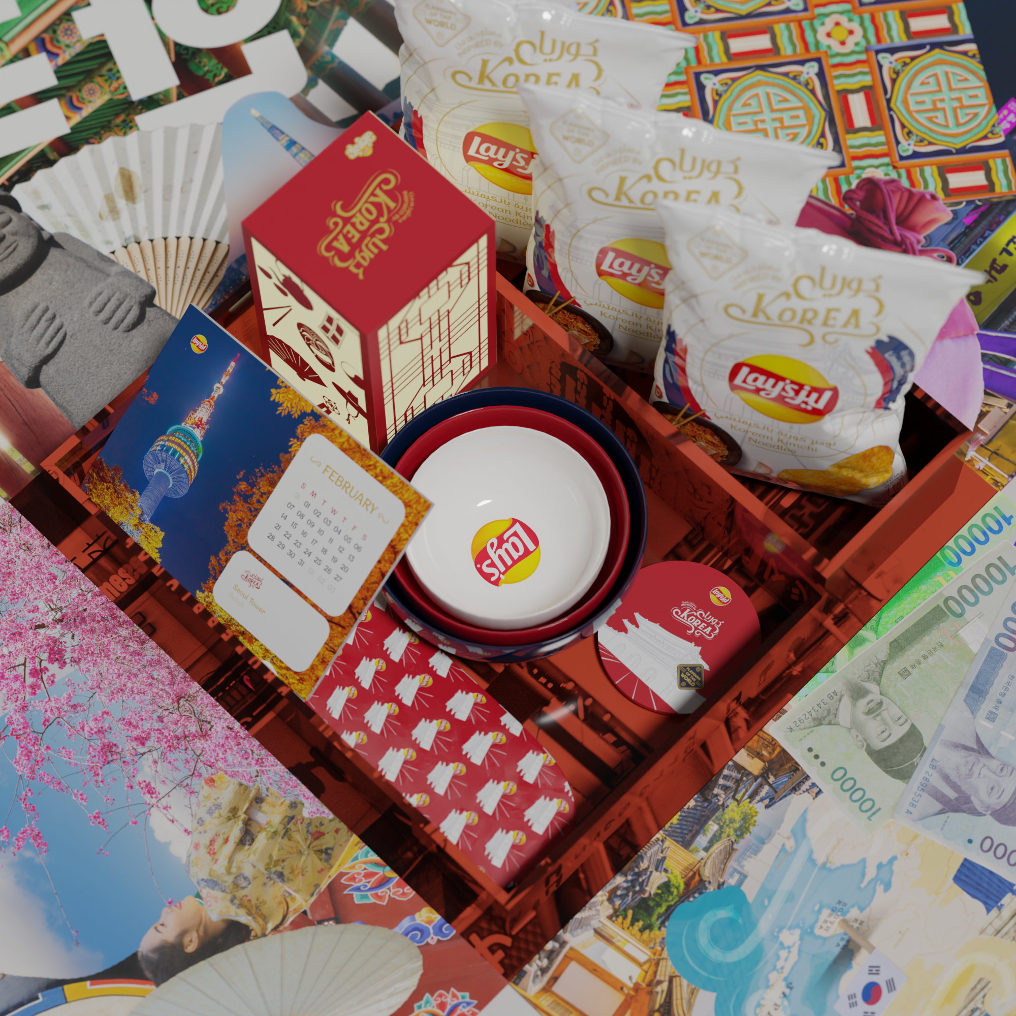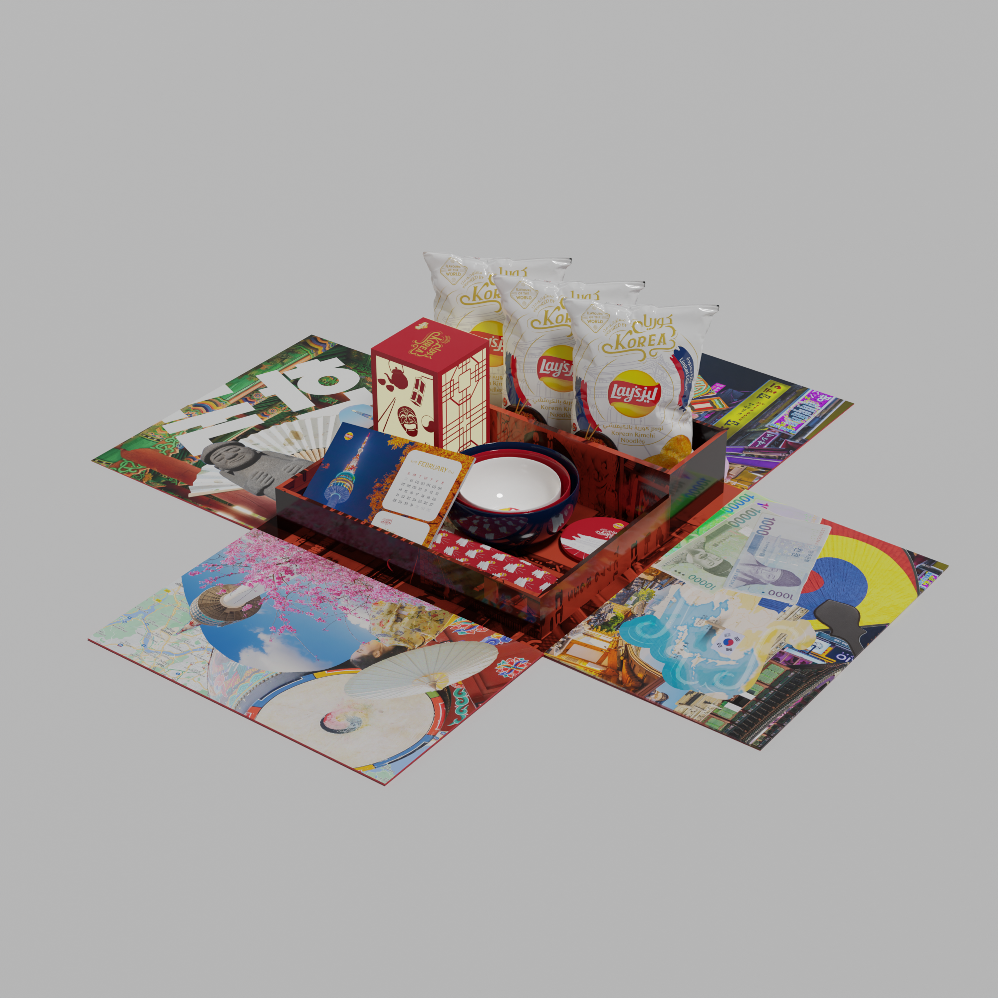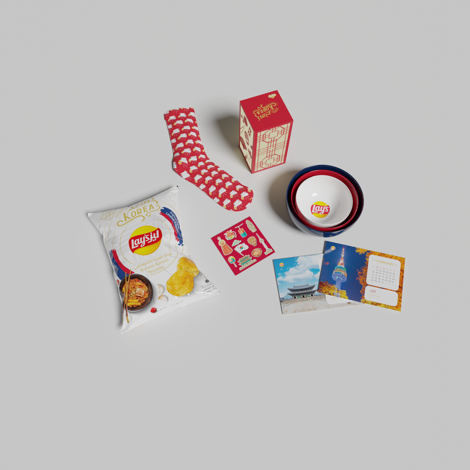 This Lay's box, dedicated to the irresistible "Korean Kimchi Noodles" flavor, is a feast for the senses. Its lid, subtly adorned with Korean-inspired elements, opens to reveal a stunning collage of Korean culture enveloping the box's sides, immersing you in the rich tapestry of Korea. At its heart lies the star of the show – bags of Lay's "Korean Kimchi Noodles" chips – accompanied by a charming Korean lantern for an authentic touch. Complementing your snacking journey, you'll discover delightful extras like stickers featuring iconic Korean symbols for personalization, a magnet calendar boasting breathtaking Korean landscapes, and specially designed Korean-themed socks and Lay's branded bowls. This box transforms snacking into an enchanting cultural adventure, celebrating the flavors and essence of Korea.