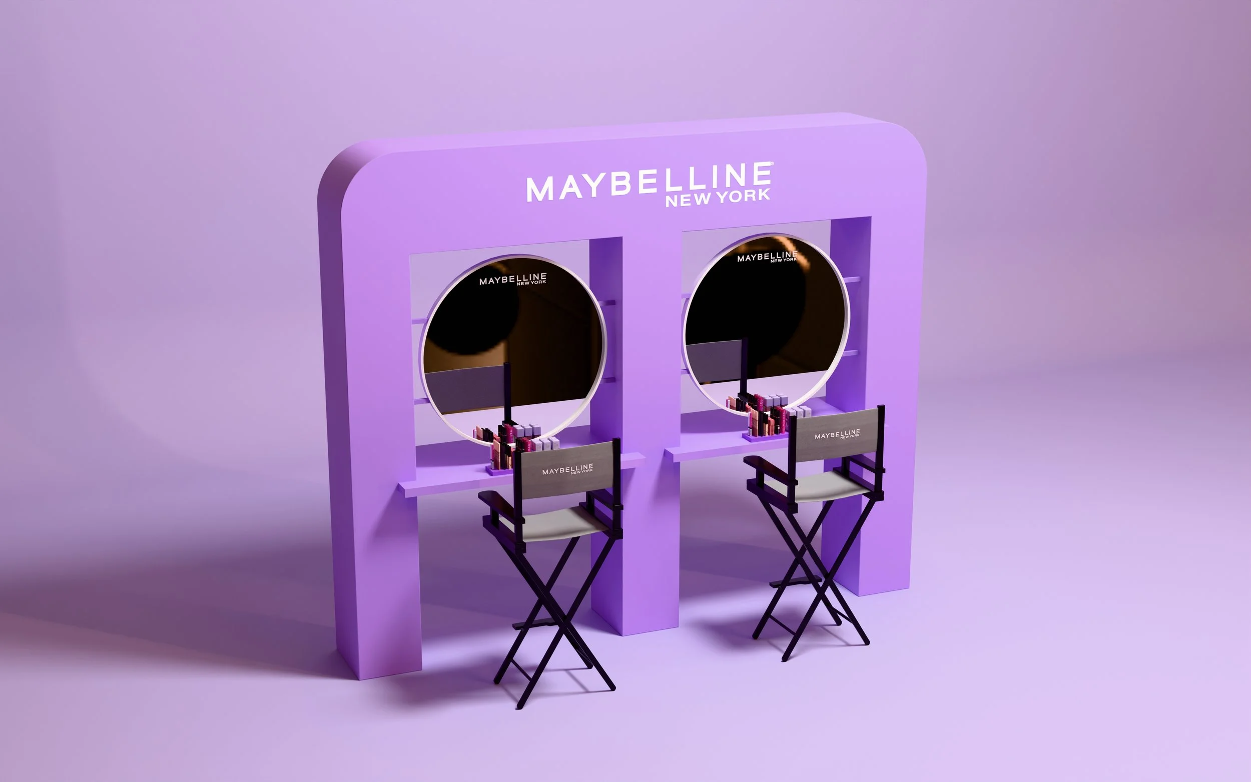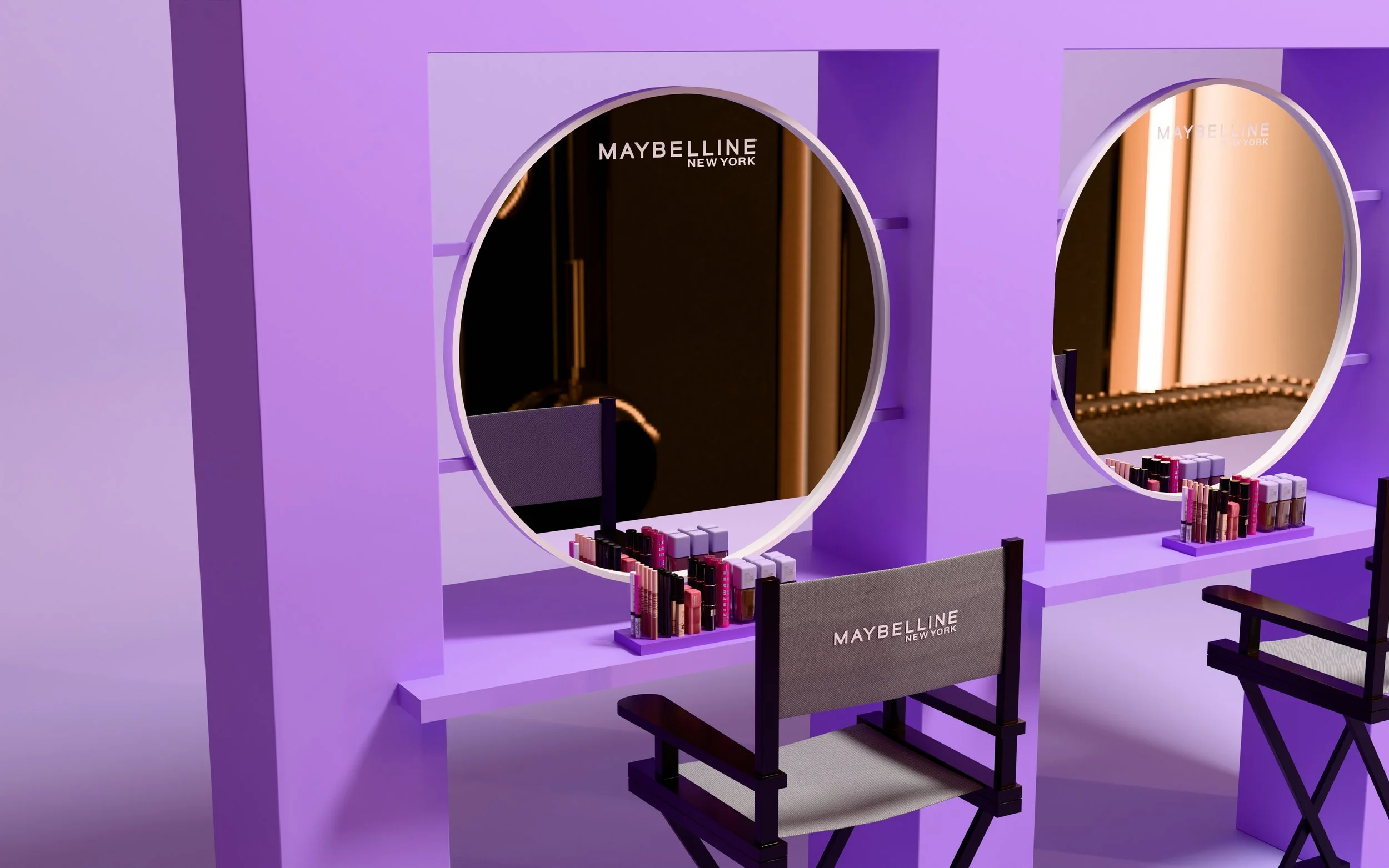 Makeup stations with suspended, floating mirrors invited attendees to experience the Lumi-Matte range in a playful yet elevated setting, while a sleek product display showcased the full collection.